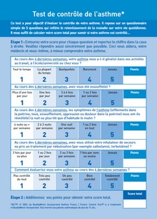 Ce test permet d’évaluer rapidement le niveau de contrôle de l’asthme des patients âgés de plus de 12 ans. Il est validé et intégré dans les recommandations internationales sur la prise en charge de l’asthme (GINA). Il peut être téléchargé sur le site de l’association Asthme et Allergies en cliquant ici.