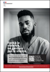 Ces affiches sont également déclinées à destination des professionnels de santé, pour diffusion dans leurs lieux de repos. Le QR code invite à porter plainte.