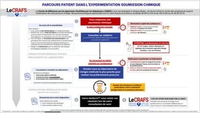 - plusieurs outils présentant le circuit proposé dans le cadre de l’expérimentation aux personnes suspectant une soumission chimique : une fiche destinée aux potentielles victimes et un document à l’intention des professionnels de santé concernés ;