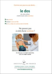 L’information des parents est capitale puisque deux signes d’alerte, simples et visibles à l’œil nu, existent. Alors que leur présence justifie une consultation médicale, leur absence doit être revérifiée une à deux fois par an pendant toute la période de croissance de l’enfant. Pour faire connaître ces signes, la Fondation pour la recherche en pathologies rachidienne Yves Cotrel – Institut de France propose deux outils, disponibles auprès du Cespharm :